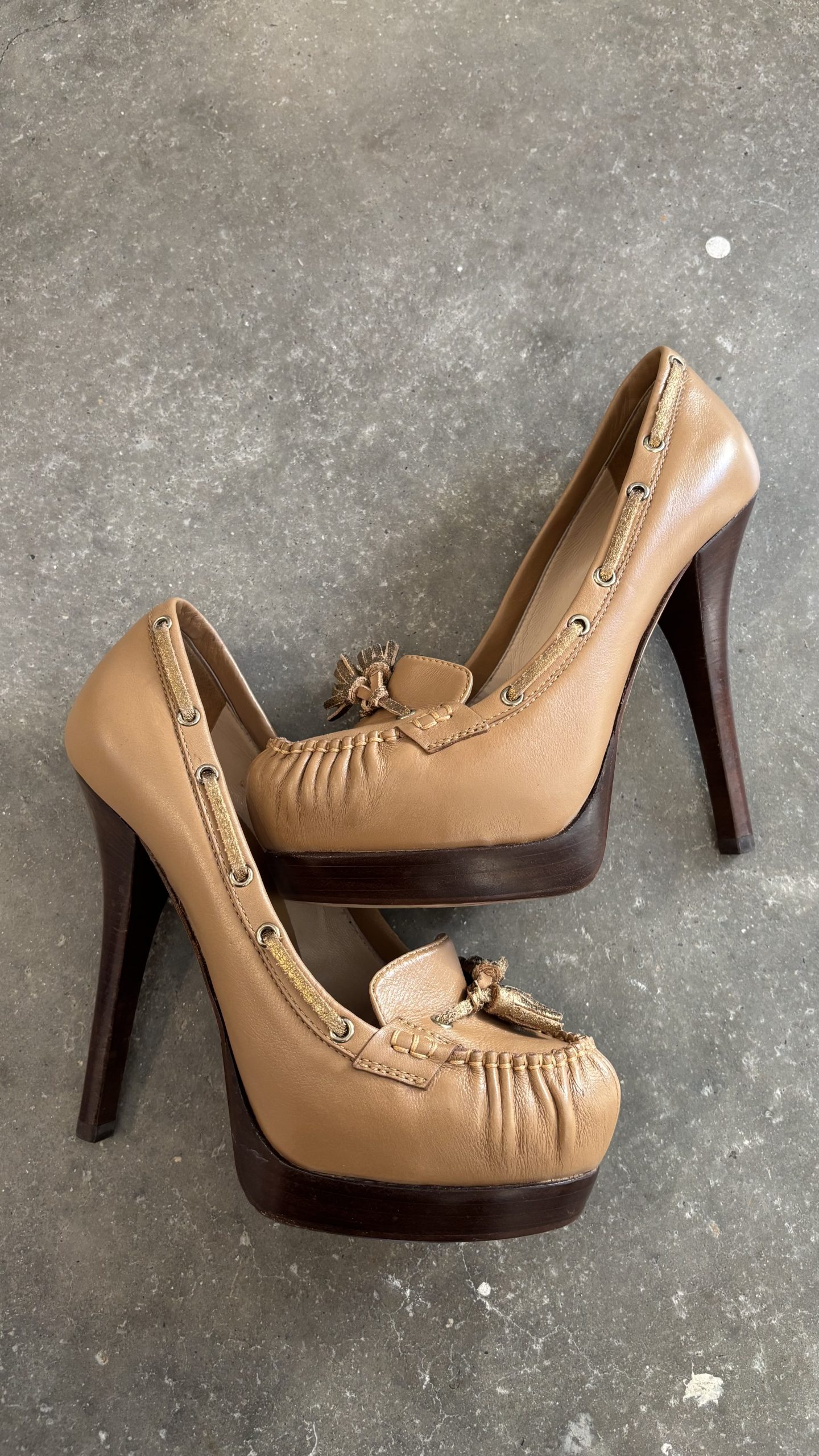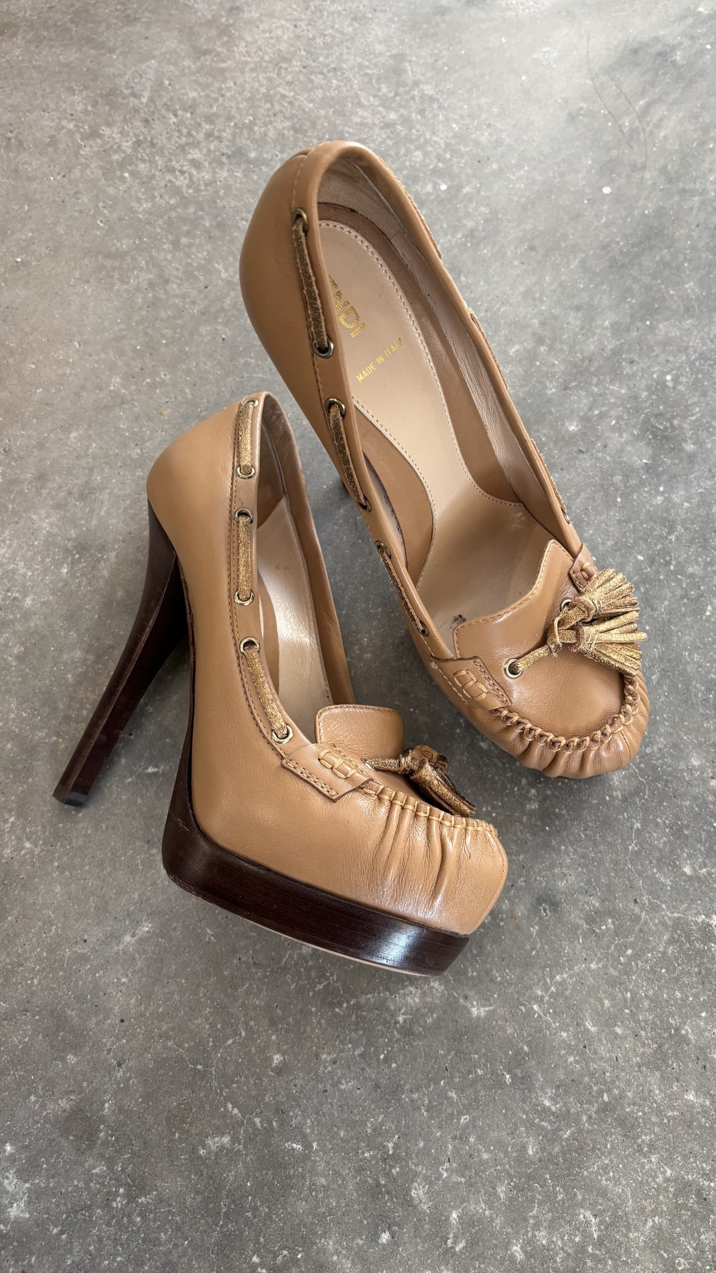 Ürünler küçük aşınma belirtileri gösteriyor. Ayakkabılarda tabanlarda, tabanlıklarda ve topuklarda hafif sürtünme gibi aşınmalar görülebilir. El çantaları ve aksesuarlarda hafif aşınmış köşeler, hafif çizikler ve iç kısımlarda aşınma olabilir.