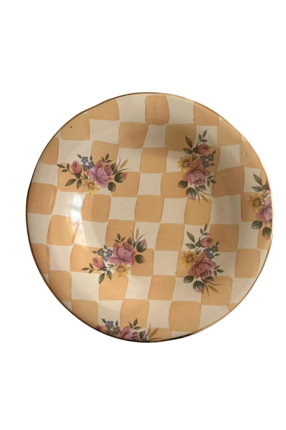 McKenzie Childs’tan seramik klasik kareli, yumuşak beyaz ve bej renkli, çiçek motifli, elle boyanmış pişmiş toprak tabak. ABD’de üretilmiştir. Yaklaşık 1995 yılı koleksiyonundan. Üretimi Durdurulmuş Vintage bir seridir.